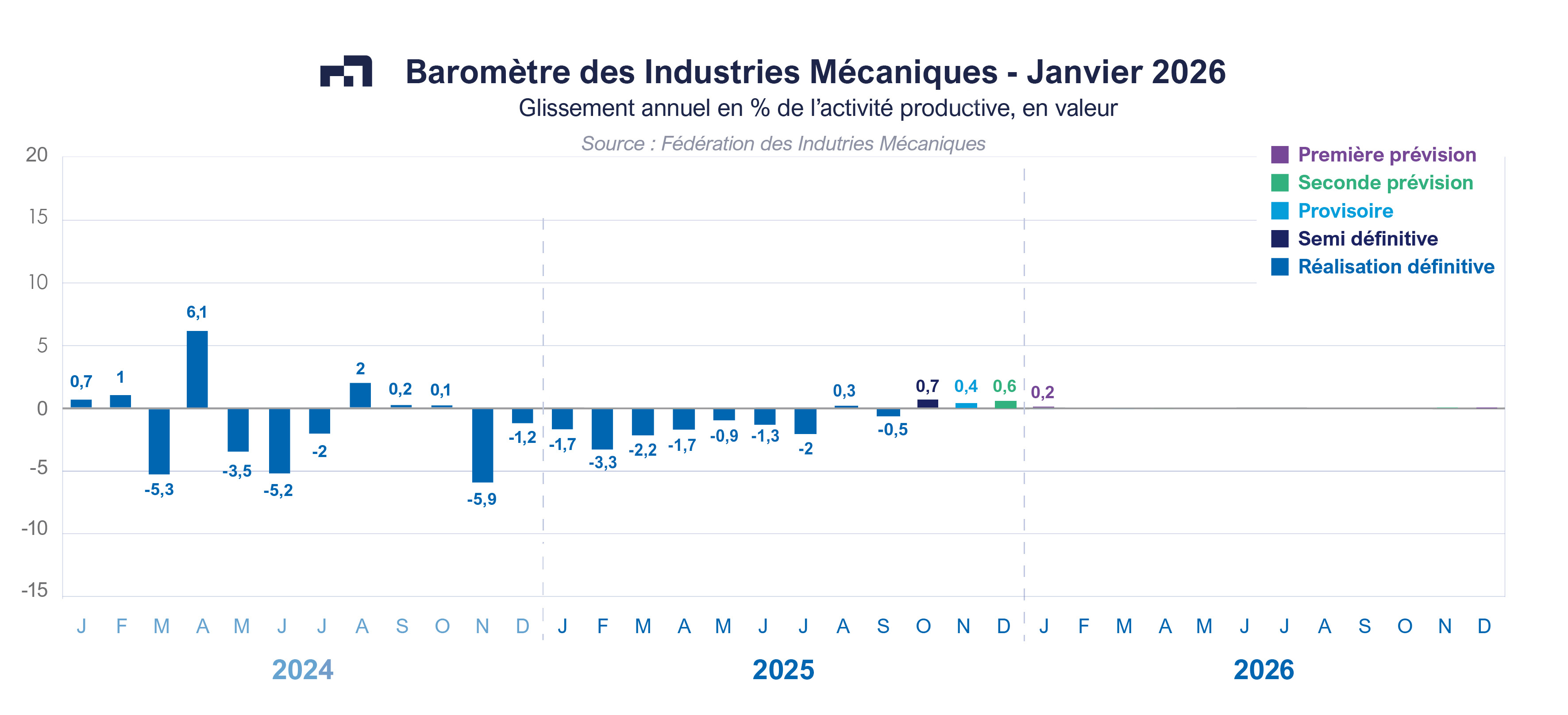 L’activité évolue différemment au mois de novembre 2025 selon les secteurs économiques. D’après l’enquête Insee de novembre 2025, le climat des affaires s’améliore nettement grâce aux secteurs des services alors qu’il se maintient dans le bâtiment et le commerce de gros, un léger repli étant enregistré dans l’industrie et le commerce de détail. Cette tendance globale se traduit par des hausses des facturations des industries mécaniques selon le baromètre FIM, soit + 0,4 % au mois de novembre et + 0,6 % en décembre 2025 en glissement annuel. La réalisation au cours des dix premiers mois de 2025 correspondant ainsi à un recul de – 0,9 % selon les statistiques mensuelles de l’Insee, les baisses étant enregistrées tout au long du premier semestre.