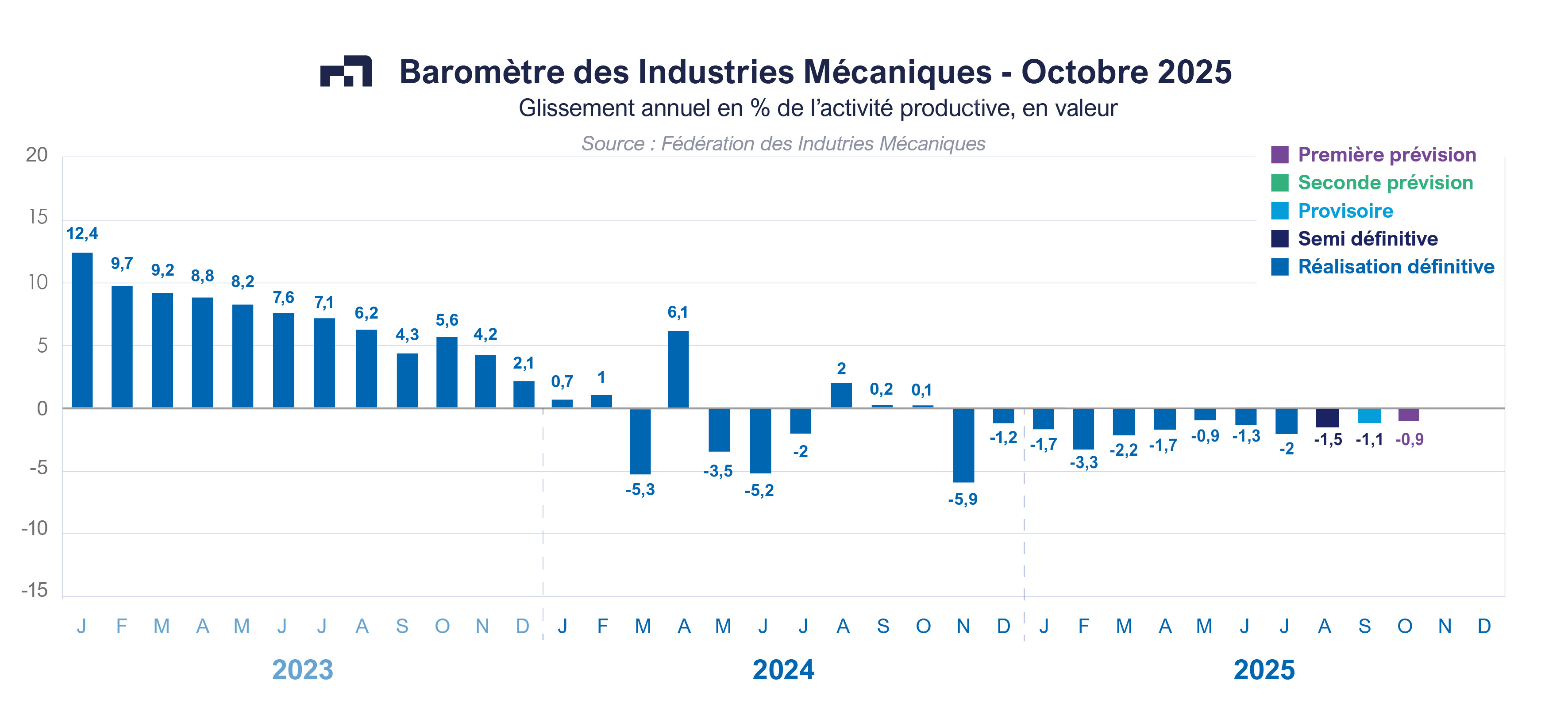 Selon l’enquête réalisée par la Banque de France au début de septembre 2025, l’activité globale progresse en France malgré des évolutions contrastées selon les secteurs. L’automobile, le caoutchouc, le plastique et le textile enregistrent un ralentissement alors que les biens d’équipement, l’aéronautique et l’industrie pharmaceutique accélèrent. Dans l’ensemble, la production industrielle demeure contrastée mais orientée favorablement. A l’inverse, le climat des affaires se dégrade dans le commerce de détail et dans le service. Quant au bâtiment, le secteur enregistre une stabilisation. Toutes ces tendances sectorielles se traduisent par une atténuation de la baisse des facturations des industries mécaniques. Le recul devrait être ramené à – 0,9 % au mois d’octobre selon le baromètre des industries mécaniques contre – 2 % au mois de juillet 2025.